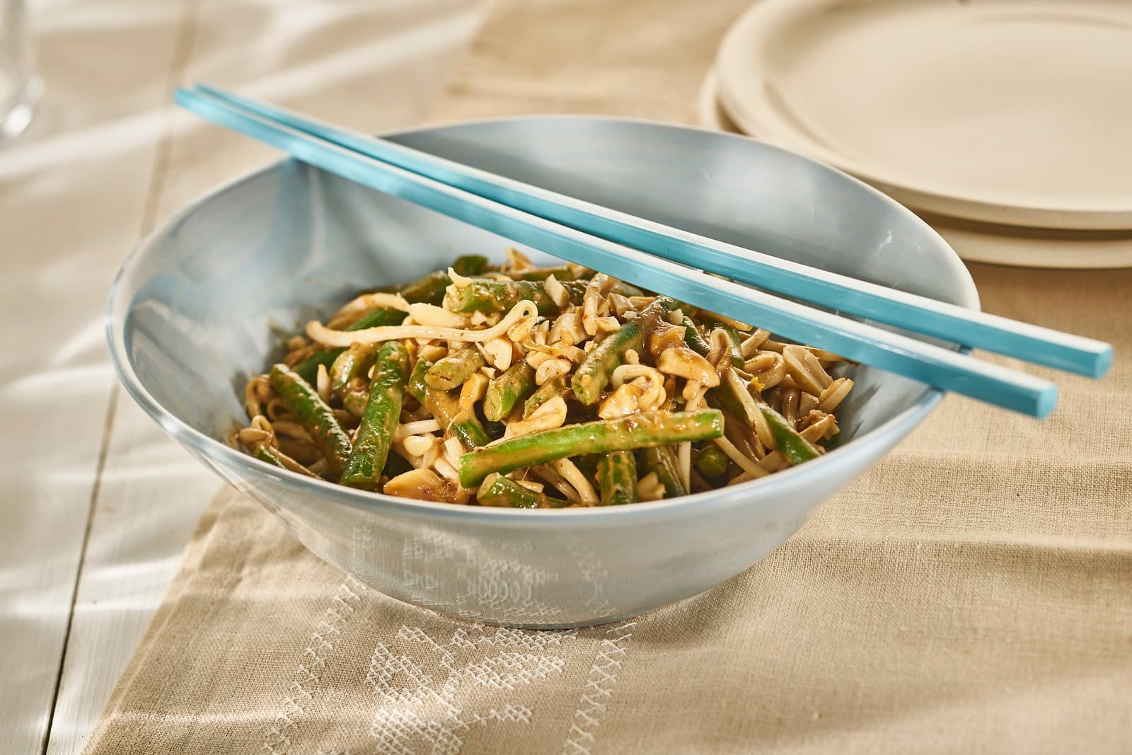 A dish that proves that eating healthy needs to be far from boring. Together, the crunchy green beans and bean sprouts provide texture and freshness, while the mild peanut sauce with soy sauce and a pinch of ginger gives it that typical oriental flavour. The combination of fibre-rich vegetables and healthy fats makes this recipe filling and stable for your blood sugar. You can serve this dish as a light supper or as a side dish with steamed fish or tofu, for example.