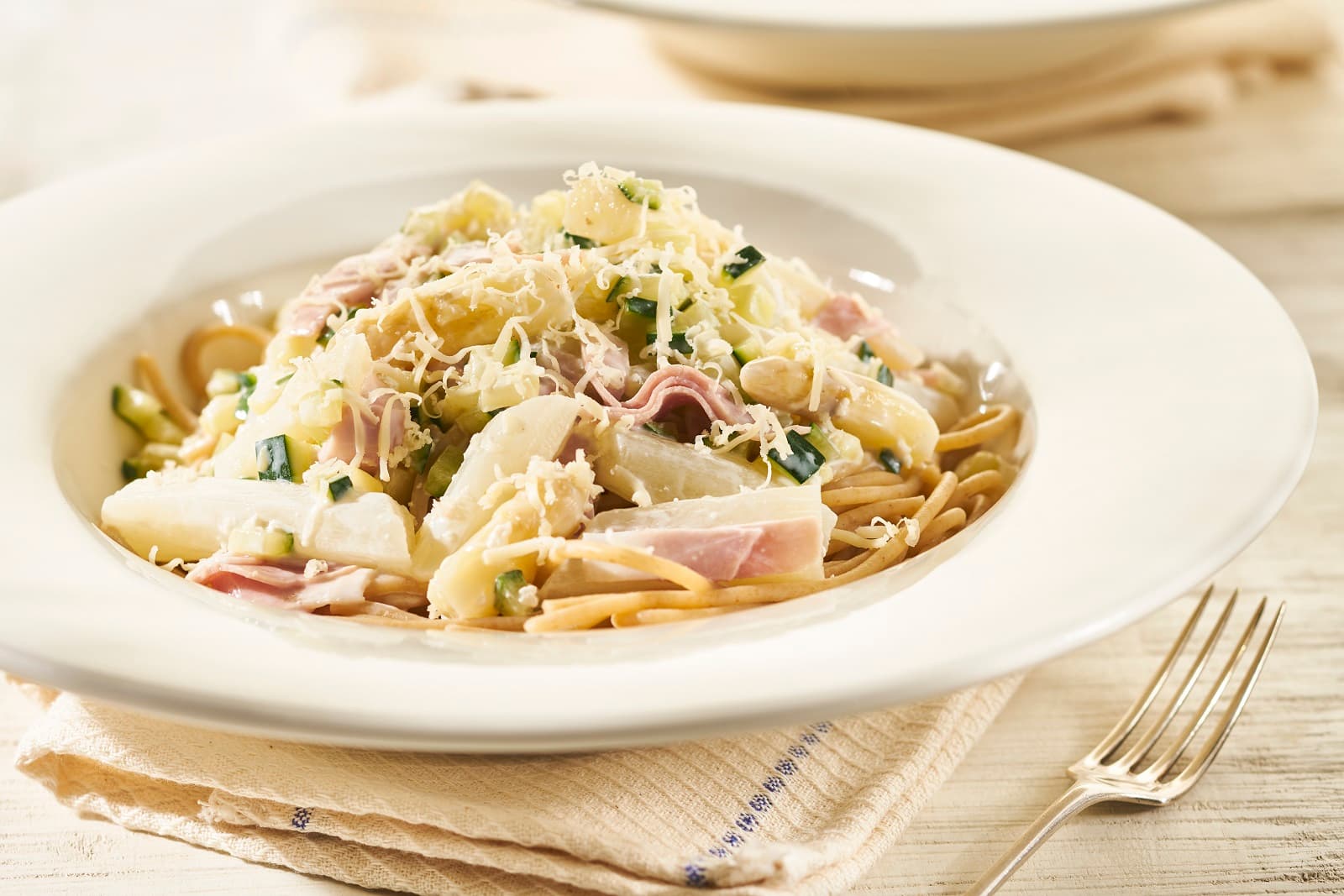 3. Witte asperges door de pasta met courgette en ham