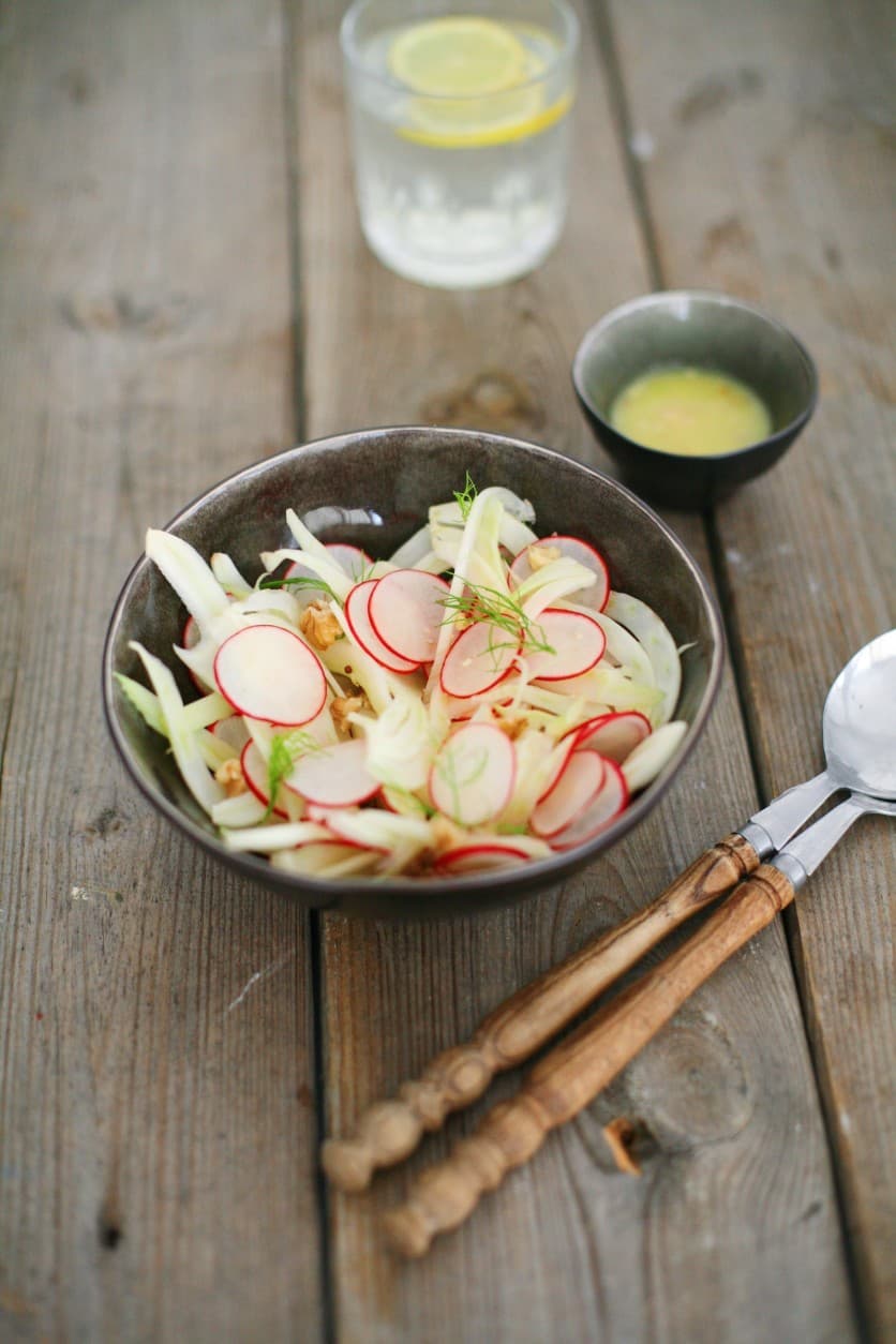 In deze salade wordt venkel gecombineerd met radijsjes en walnoten. Het gerecht wordt op smaak gebracht met een sausje. Dat bestaat uit citroensap, mosterd en peper. Dit gerecht kan je eten als een hoofdgerecht, maar kan ook een onderdeel zijn van een grotere maaltijd. Zo kan je de salade aanvullen met gestoomde makreel en aardappelen. Deze salade bevat per persoon 230 gram groenten.