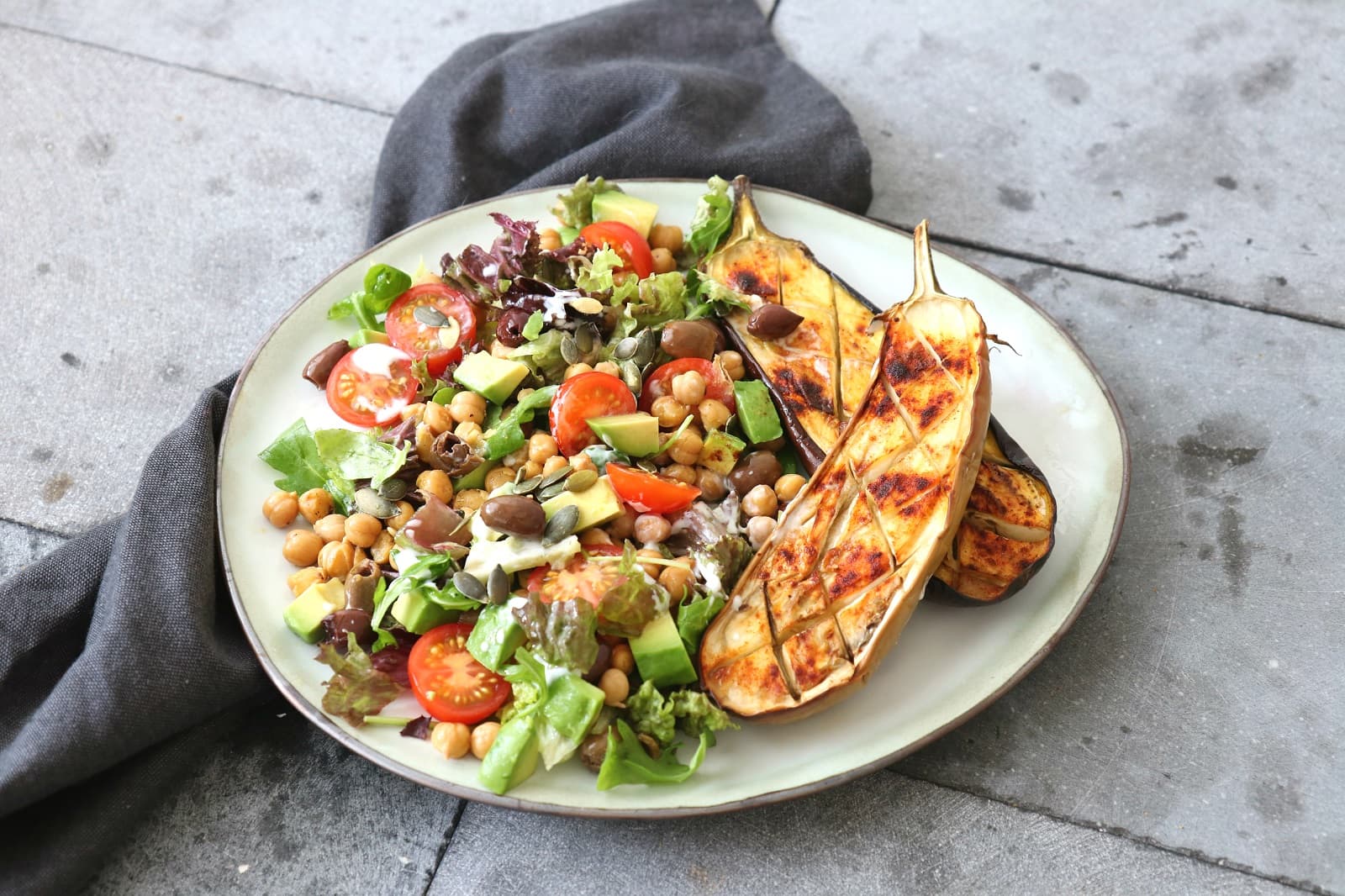 Lekker en gezond: maaltijdsalade met geroosterde aubergine en kikkererwten