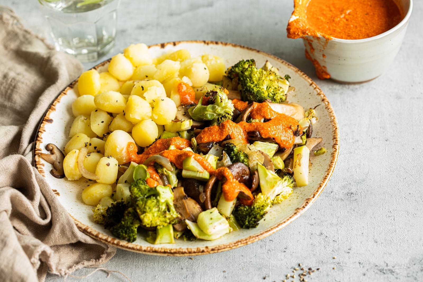 Een verrassender optie is de broccoli ovenschotel met Romesco saus, waarin broccoli, paddenstoelen en aardappel worden gecombineerd met een Spaanse Romesco saus van paprika en amandel. Deze saus geeft een diepere, iets rokerige smaak die het gerecht meteen bijzonder maakt zonder moeilijk te zijn. Het is een ideale ovenschotel voor wie nét even iets anders wil dan de klassieke combinaties, maar toch een voedzame maaltijd wil serveren.