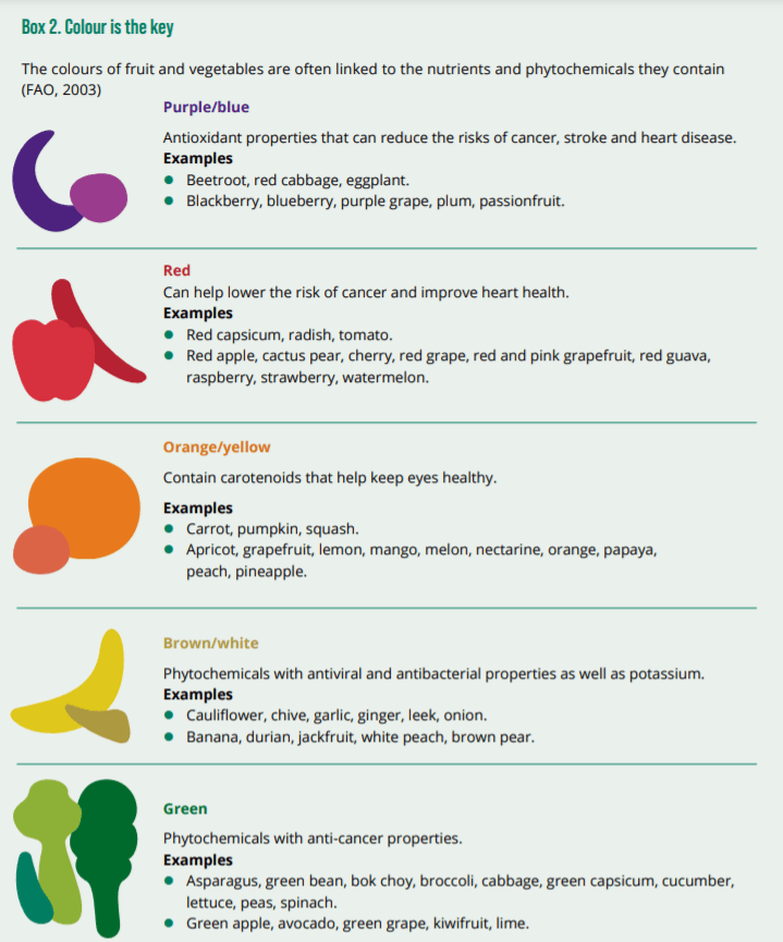 Ga voor Kleur is een initiatief van het Nationaal Actieplan Groenten en Fruit (NAGF). Hiermee wil het NAGF Nederlanders op een laagdrempelige manier stimuleren om voor veel verschillende kleuren (groenten en fruit) op je bord te gaan. Maar waarom is dit belangrijk? De Food and Agriculture Organization (FAO), de Voedsel- en Landbouworganisatie van de Verenigde Naties, legt dit mooi uit in de figuur hier onder uit hun background paper voor het International Year of Fruits and Vegetables 2021 die vorige week is gepubliceerd. Door verschillende kleuren groenten en fruit te kiezen zorg je ervoor dat je een zo compleet mogelijke samenstelling van vitamines en mineralen binnenkrijgt.