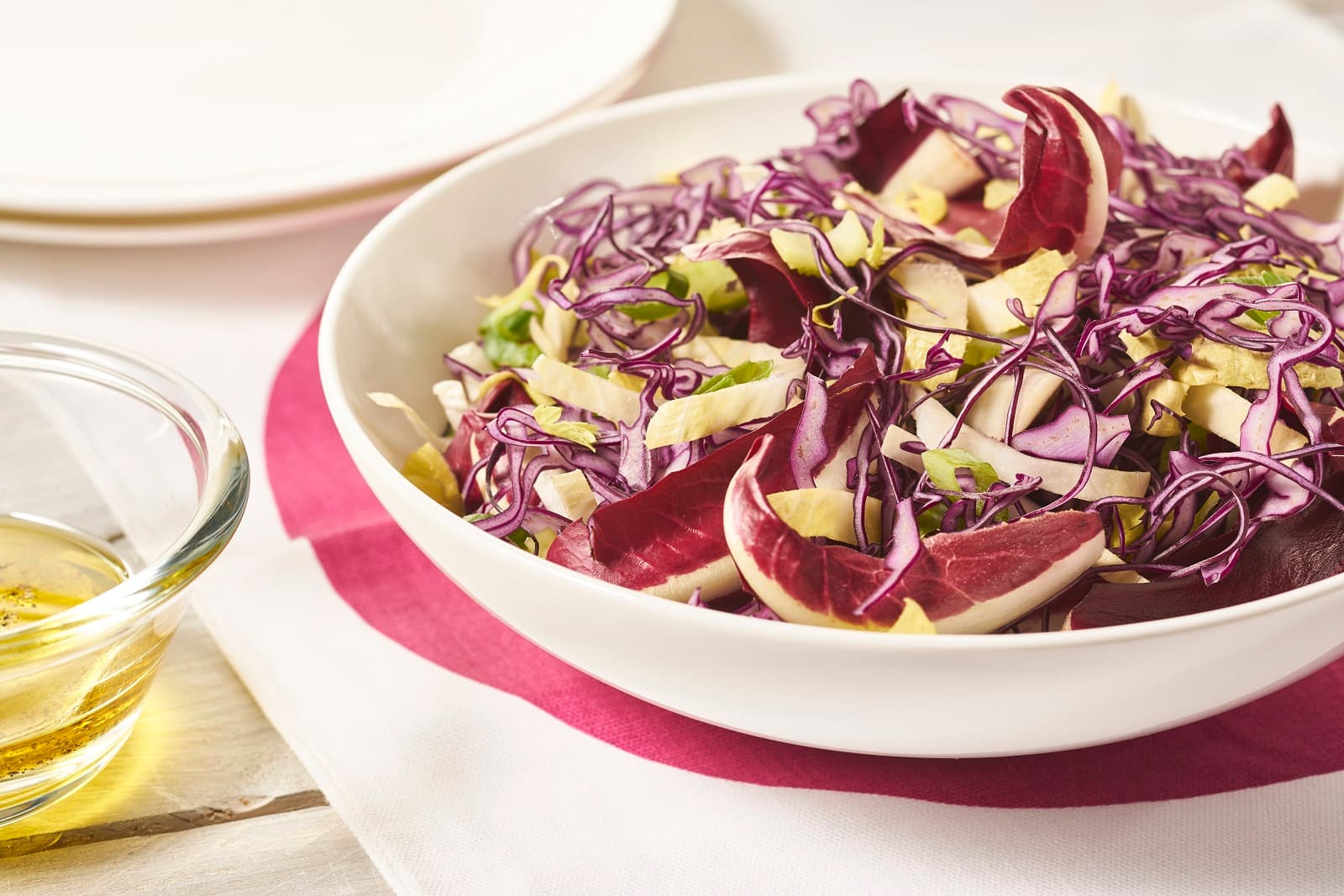 Zin om een lekker winters gerecht met seizoensgroenten te maken? Probeer dan eens deze winterse salade met witlof, bosui, radicchio, rode kool en bleekselderij. Zo haal je ook nog eens met gemak de aanbevolen dagelijkse hoeveelheid groenten van 250 gram. In dit gerecht zit namelijk 350 gram groenten per persoon! Tip: ook lekker met een gekookt ei en aardappelen.