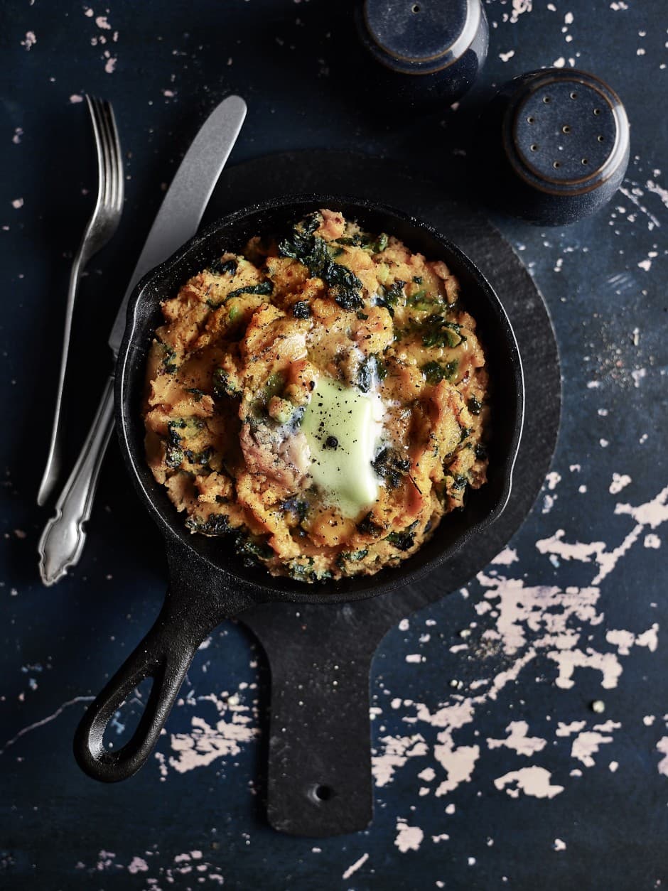 Zoete aardappel stamppot met kalettes
