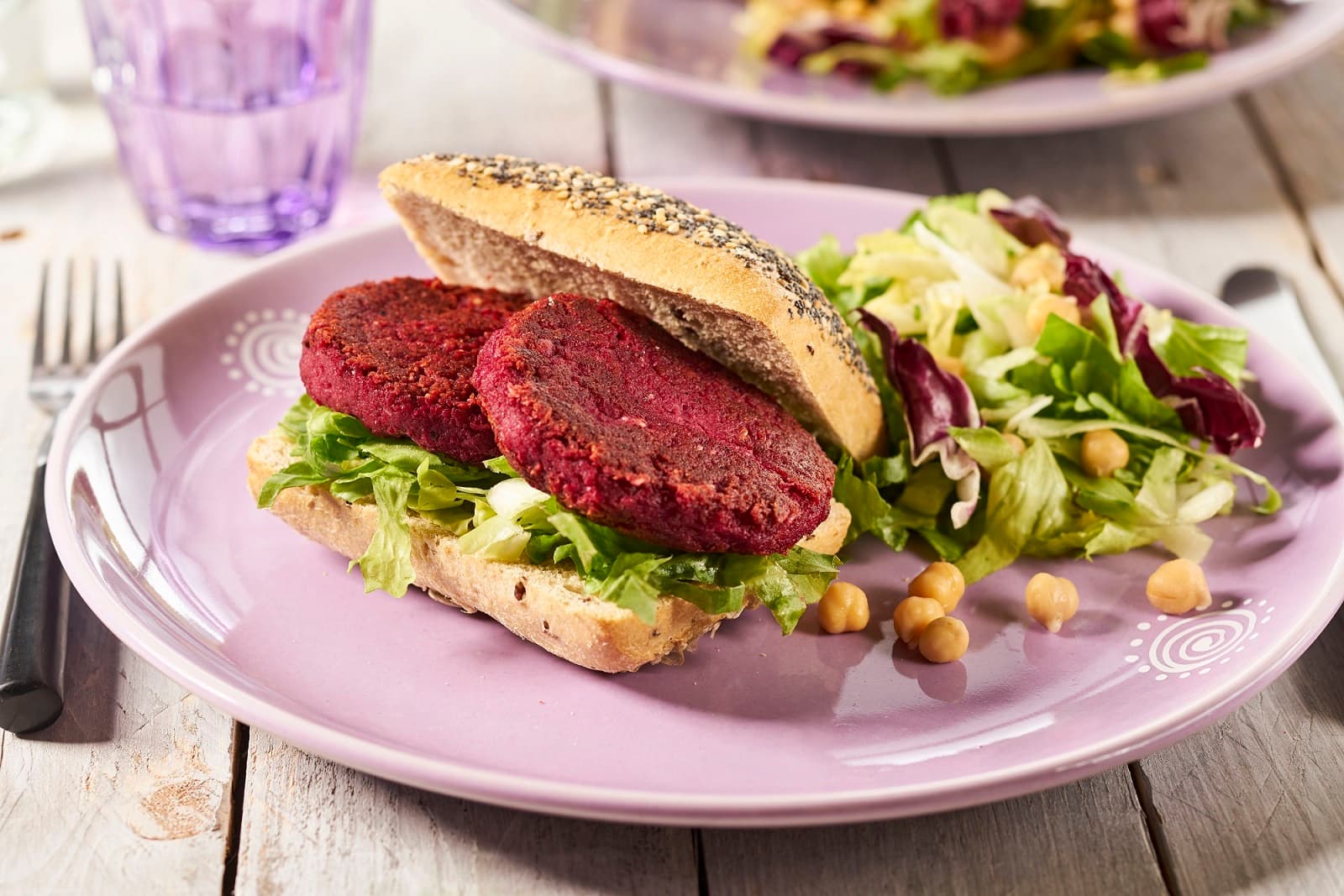 Wie zegt dat een burger altijd zwaar en machtig moet zijn? Deze rode bietenburger met andijviesalade is het frisse, kleurrijke bewijs van het tegendeel. De diepe smaak van rode biet vormt een verrassend lekkere combinatie met knapperige andijvie en sappige appel. Licht, voedzaam én boordevol groente.