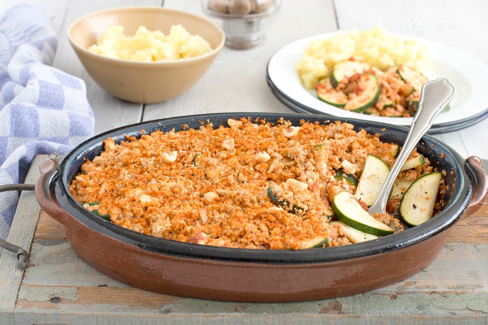 Dit smaakvolle gerecht toont hoe brood kan dienen als een knapperige toplaag, waardoor een eenvoudig gerecht wordt getransformeerd tot een meesterwerk. De kruimelige textuur van het brood vormt een perfecte aanvulling op de zachte courgette en romige aardappelpuree.