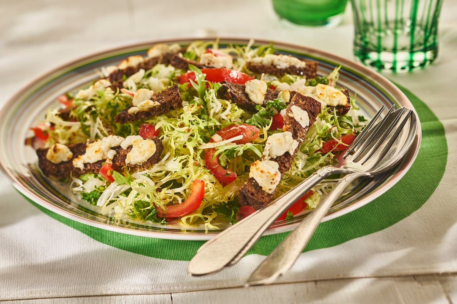 Liever een iets steviger salade? Deze variant met frisée (of andijvie), tomaat, peterselie en een honing-mosterd dressing is heerlijk in combinatie met geroosterd brood en geitenkaas.