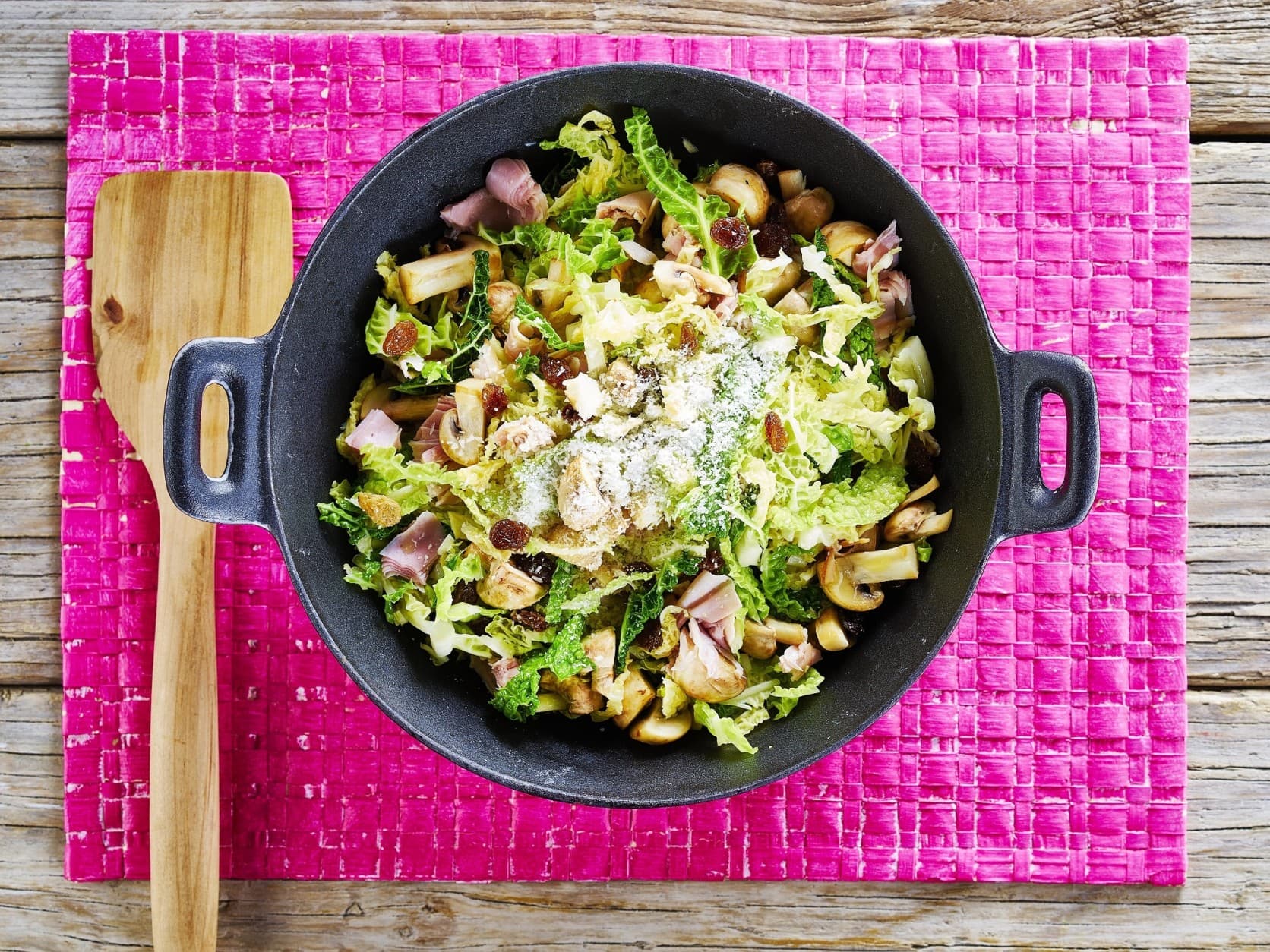 Groene kool ofwel (groene) savooiekool is een van de oudste koolsoorten ter wereld. Meestal is deze afkomstig uit Nederland, waardoor je meteen goede kwaliteit te pakken hebt. Waarschijnlijk eet je deze groente minder vaak dan bijvoorbeeld bloemkool of courgette. Daarom is de kans groot dat je niet precies weet hoe je het moet bereiden. Eigenlijk is het heel simpel. Verwijder eerst de harde buitenste bladeren van de stronk. Was de kool vervolgens goed en snijd het in dunne repen (net als een krop sla). Óf je kunt de bladeren heel laten als je ze wilt vullen. Een lekker recept om te proberen is deze geroerbakte groene kool met champignons, kokos, rozijnen en filetlapjes. Een bijzondere combinatie, maar super lekker (en budget-proof)!2. Groene kool (groene savooiekool)