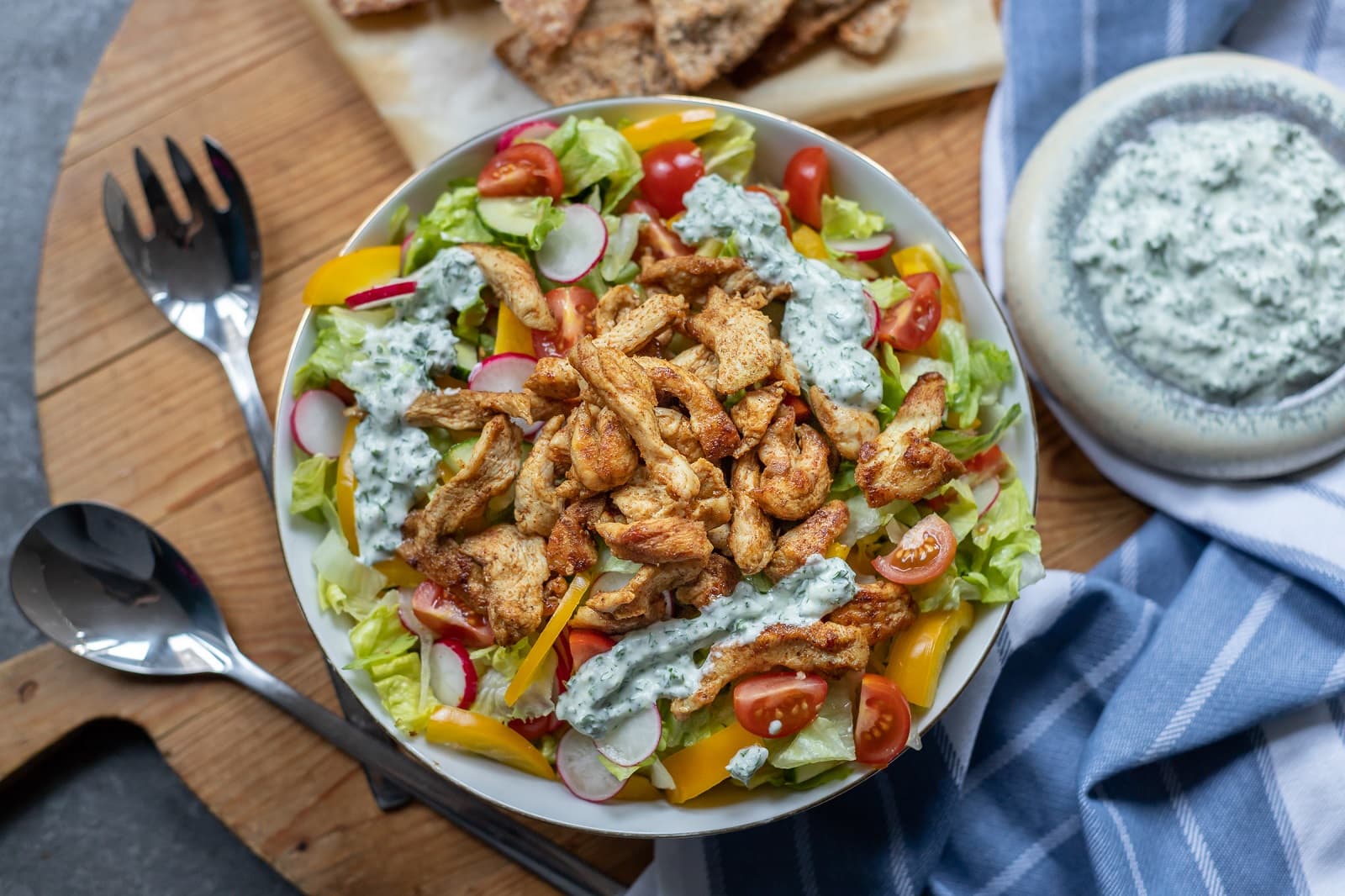 Maak je eigen gezonde versie van shoarma met dit recept. Je maakt je eigen shoarma zelf met kipfilet, shoarmakruiden en olijfolie. Dit voeg je toe aan een zelfgemaakte salade. Serveer met de frisse yoghurtdressing en volkoren pita's. Bekijk het volledige recept voor de kipshoarma salade.