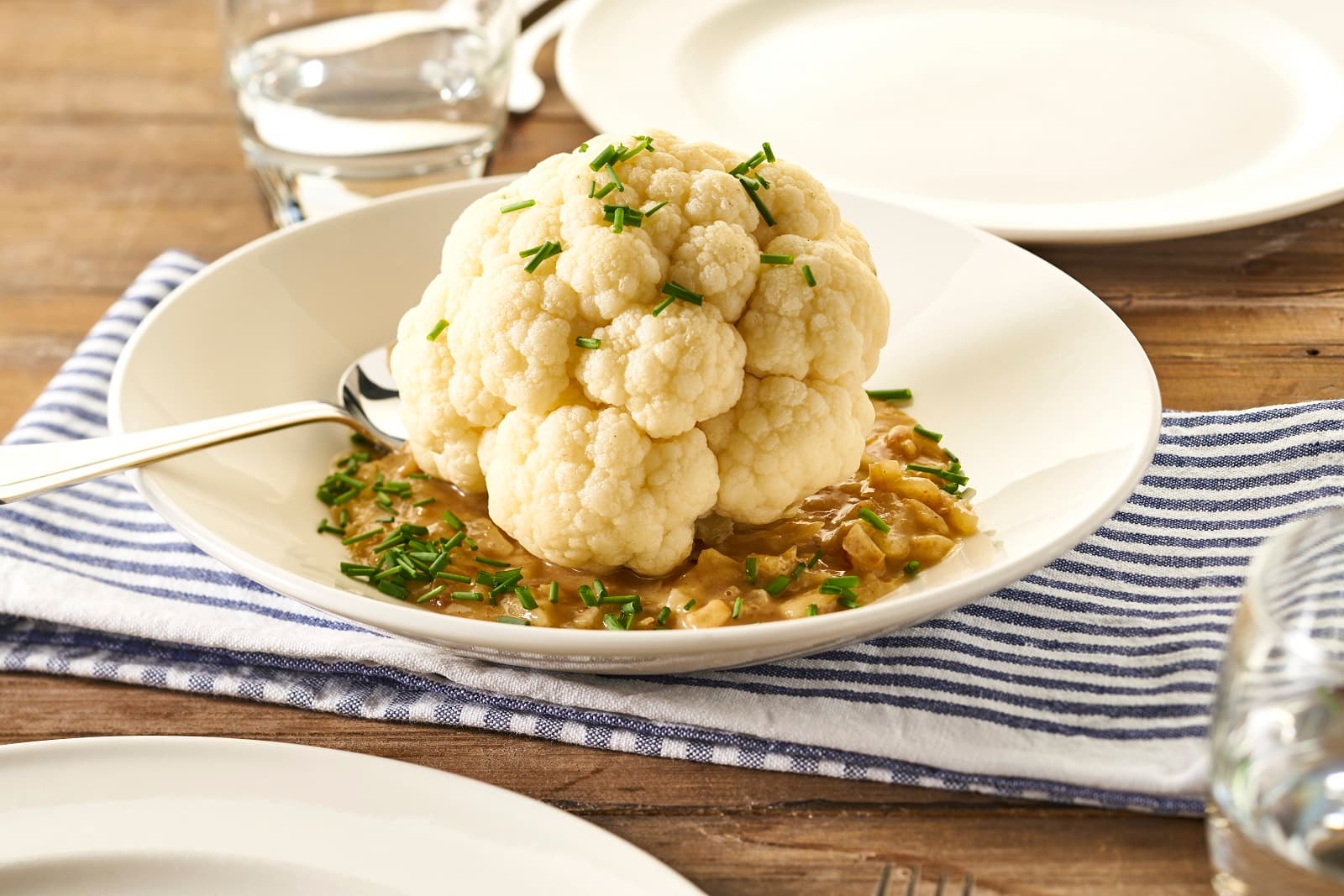 In dit recept leg je de bloemkool in een bedje van uiensaus. De saus wordt op smaak gebracht met knoflook en kruidnagel. Voor dit gerecht heb je voor twee personen één kleine bloemkool nodig. Dit gerecht is aan te vullen met gebakken tartaar of aardappelen. Zo kan je zelf bepalen hoe uitgebreid jouw maaltijd wordt.