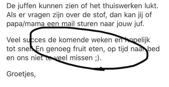 Mijn dochter van 8 greep dit moment aan om te zeggen dat ze dus daarna naar buiten mochten. Dat werd nog even versterkt door het berichtje van de buurvrouw om 9.55 uur in de app: '10 uur buitenspelen bij ons'. En dus zaten we als goede pleinwachten op het bankje voor de deur te genieten van een kopje koffie. Uiteraard wel rekening houdende met de voorschriften en houden we er voldoende afstand tussen.