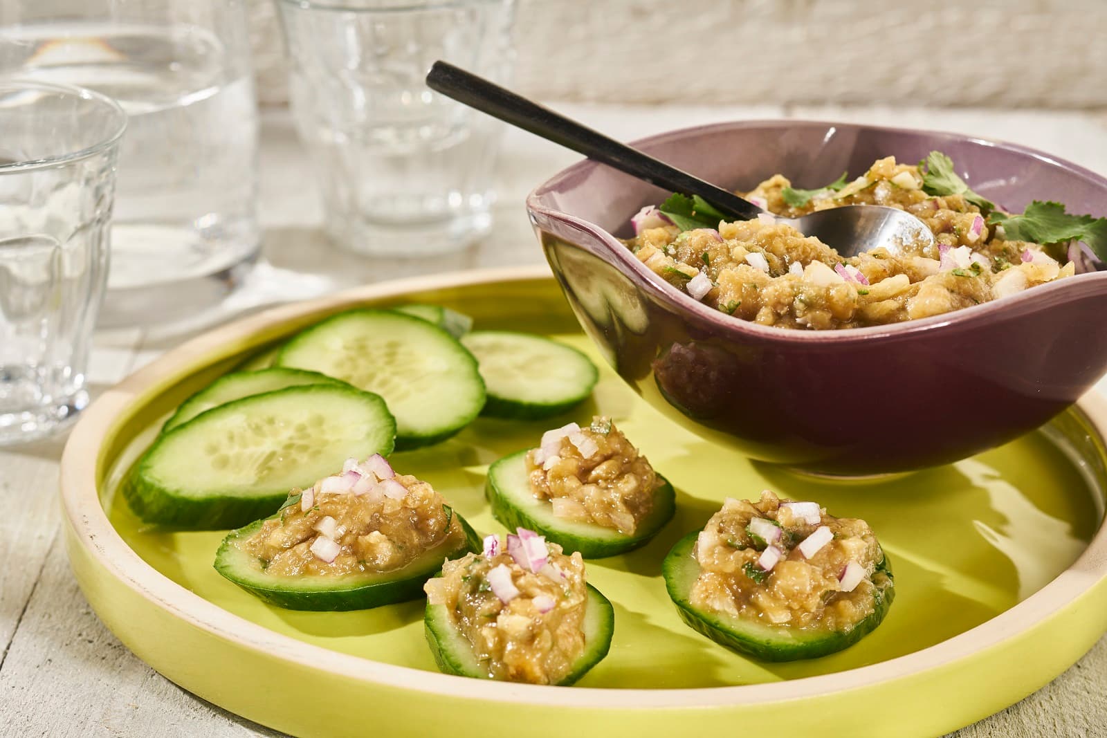 Komkommer is heerlijk als tussendoortje. Daarom ideaal te verwerken voor een lekkere snack. In dit recept wordt de komkommer gebruikt als vervangen van de toast en krijgt het hapje smaak door de auberginedip. Een snack waarmee je veel groenten binnen krijgt en is ook nog eens heel lekker.