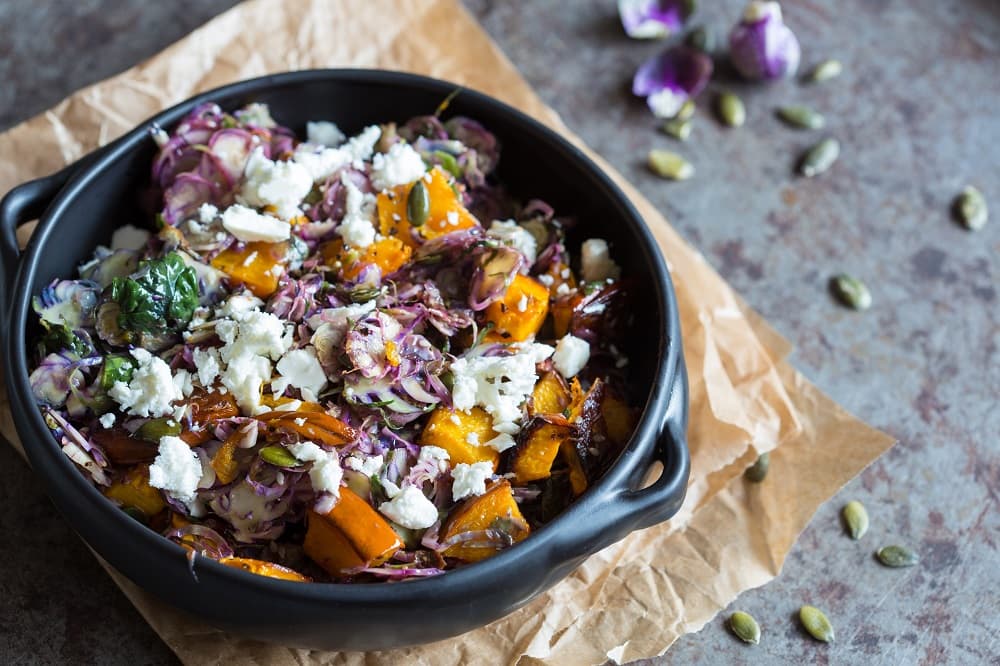 Paarse (!) spruitjessalade met pompoen en geitenkaas